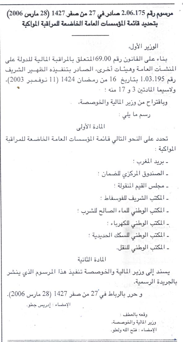 مرسوم رقم 2.06.175 صادر في 27 من صفر 1427 (28 مارس 2006) بتحديد قائمة المؤسسات العامة الخاضعة للمراقبة المواكبة