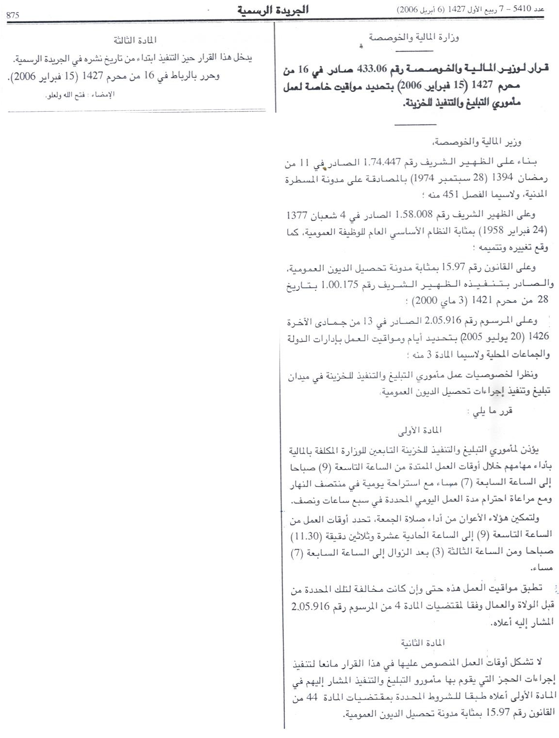قرار لوزير المالية و الخوصصة رقم 433.06 صادر في 16 من محرم 1427 (15 فبراير 2006) بتحديد مواقيت خاصة لعمل مأموري التبليغ و التنفيذ للخزينة