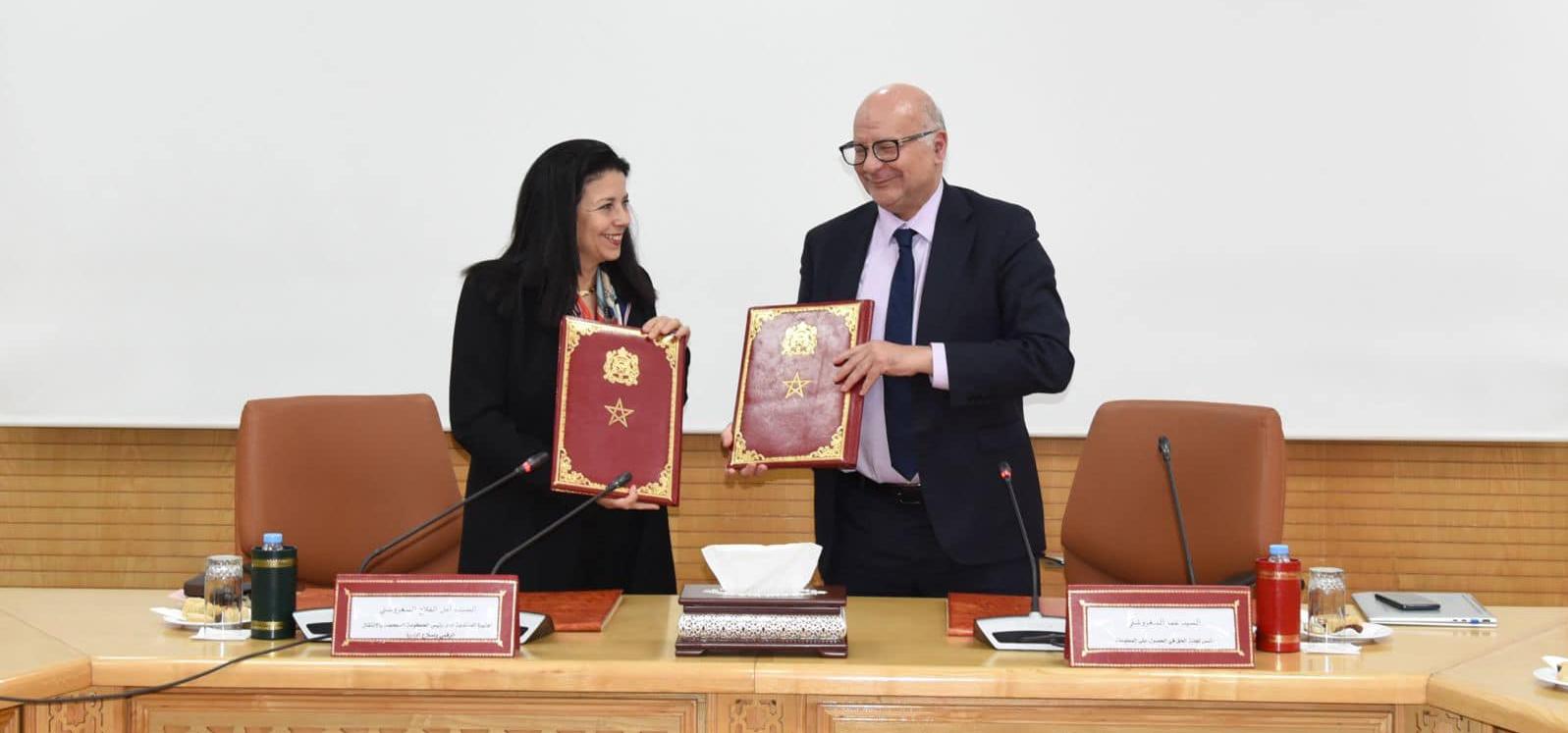 Madame la Ministre Amal EL FALLAH - SEGHROUCHNI , et M. Omar SEGHROUCHNI Président de la Commission du Droit d’Accès à l’Information (CDAI ) et de la Commission Nationale de contrôle de la protection des Données à caractère Personnel (CNDP) ont signé, le mercredi 22 janvier, une convention relative à la cession du Portail de la Transparence, www.chafafiya.ma.