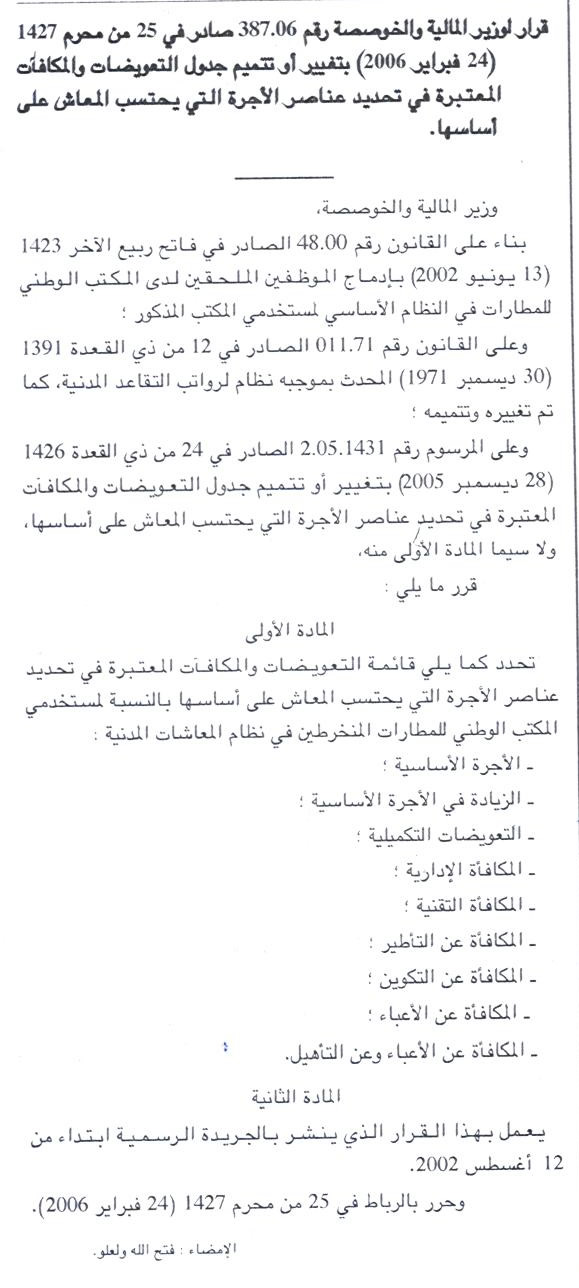 قرار لوزير المالية و الخوصصة رقم 387.06 صادر في 25 من محرم 1427 (24 فبراير 2006) بتغيير أو تتميم جدول التعويضات و المكافآت المعتبرة في تحديد عناصر اÙ